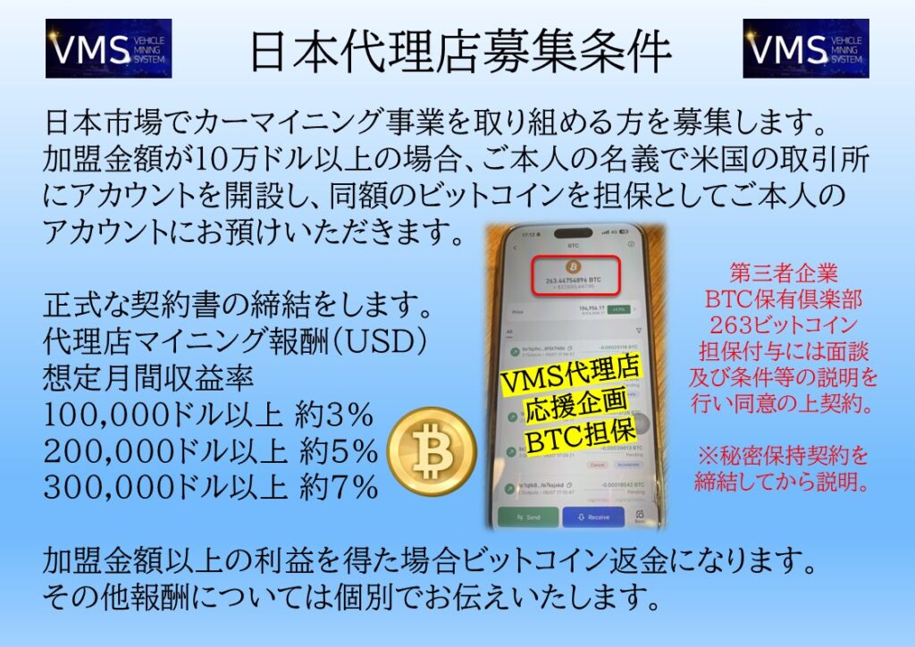 ・VMSJAPAN代理店は加盟金同等のBTCビットコイン担保がある。