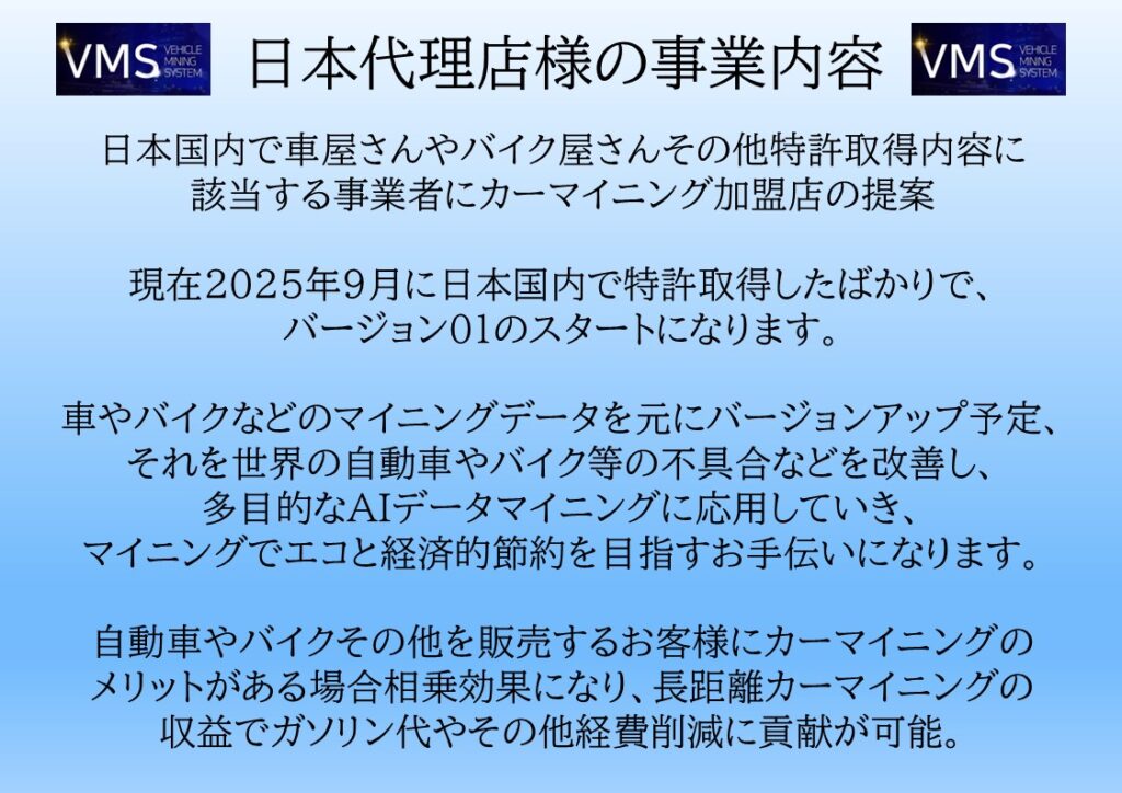 ・VMSJAPAN代理店は日本特許取得のカーマイニング機械を販売する前のVMBを取り扱うことが可能で、先行者利益が得られます。