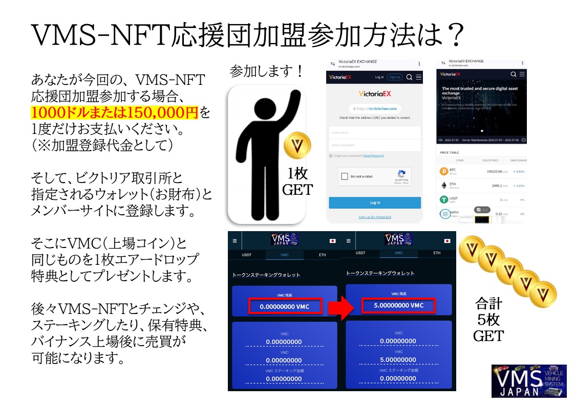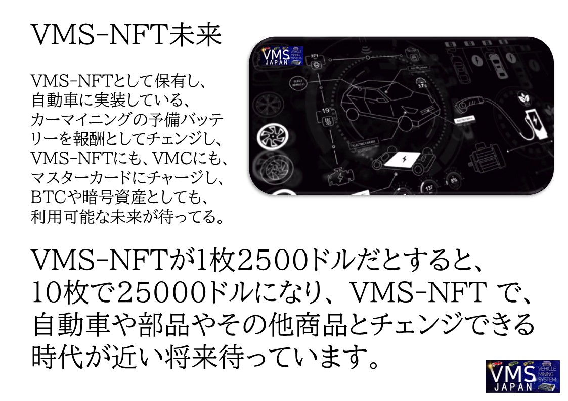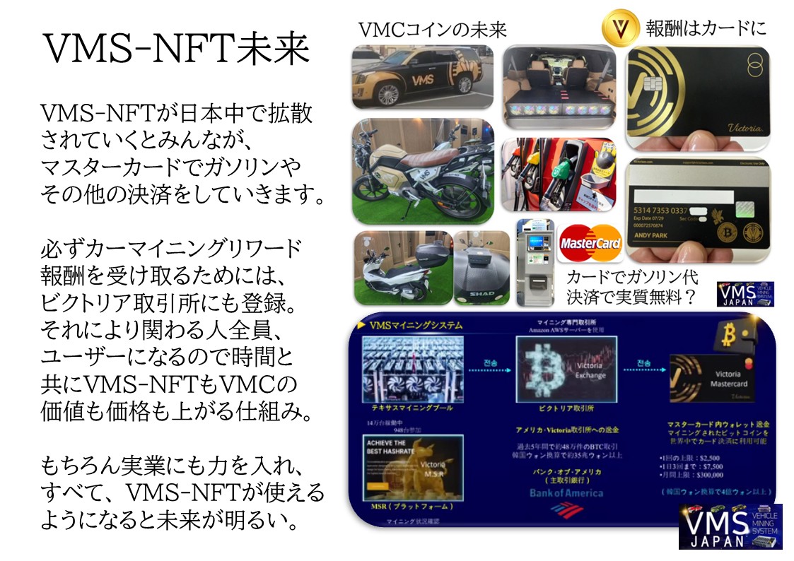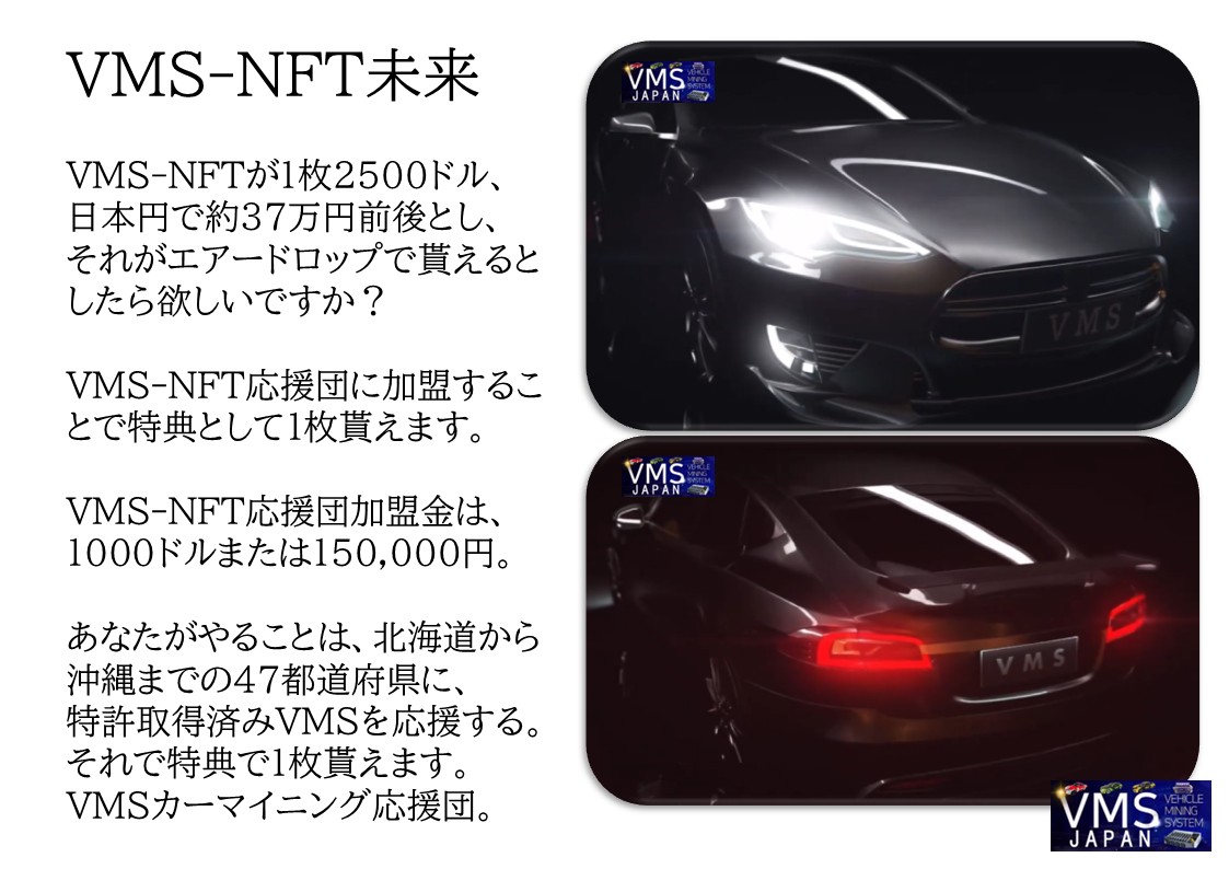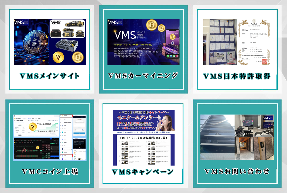 VMCコインの価値を上げ続ける カーマイニングとは? VMSJAPANカーマイニングイメージPV(1:11) 〜VMCコイン期間限定応援キャンペーン〜 取引所に上場している VMCコインをお得に貰っちゃおう♪ 今なら「無料エアードロップ」貰えます! 日本市場展開する前に海外で 盛り上がっているVMCコインの 軸となる特許取得内容をご確認ください 特許第 7743164 号 車両用暗号通貨採掘システム 発明者 パク ガラム 2023-573374 出願日2022年1月28日 登録日2025年9月12日 発行日2025年9月24日 特許情報プラットフォーム|J-PlatPat [JPP] https://www.j-platpat.inpit.go.jp/ 検索 2023-573374 【VMSのNFT応援企画】 今からVMSをNFTにして 流通していきます。 先行モニターとしてVMSの NFTモニター参加者には、 VMC1枚を 無料エアードロッププレゼントします!! VMSとは? VMCコインとは? こちらをご覧ください。 VMS-NFT応援団として参加する場合、 加盟登録代金として 1000ドルまたは 150,000円をお支払いください。 ※1000ドルまたは150,000円は、 VMS-NFT応援団加盟登録費としてお支払いすると 特典としてVMC1枚を 無料エアードロッププレゼントします!! ご理解できるかたのみご参加ください。 【VMS-NFT応援団として参加する】 無料エアードロップで貰った (VMCコイン売買条件)をお伝えします。 バイナンス取引所上場後に月間5%~10%だけ 利確(売却)するという条件になります。 または、VMS-NFTが完成した時に、 NFTとして利用可能です。 ステーキングするとメリットあります。 ※バイナンス取引所上場 2025年12月または2026年早期予定 専用アカウントを開設していただき、 そこにVMCを付与します。 1枚以上欲しい方は個別相談とします。 【VMCコインの発行元及び会社】 VMSコリア株式会社 本社見学動画(1:00) 2025年11月11日からマイニングカフェも オープンして後々VMCコインも使えるようになり、 120室のホテルも買収してマイニングホテルや、 キャンピングカーマイニングや、 色々なところでVMCコインが使えるようにします。 日本ではVMS-NFT流通でVMCも使えるようにします。 今のお得なエアードロップの時に、 ご参加いただけますと幸いです。 今回の企画は日本で事業展開するときに、 多くの方に1枚だけでもVMCを 持っていただき、共に長期的に、 事業とVMCの価値を上げていただき、 5億枚から4億枚無くした、 最終の1億枚になった時1枚の価値と価格で 幸せを感じていただきたいと思います。 1000ドルまたは、150,000円加盟金で、 2500ドル相当が60%OFFですね♪ VMC1枚を無料エアードロップで お得に参加して応援団としてご協力お願いします。 【VMS-NFT応援団として参加する】 VMS-NFT応援団に参加して 1VMCを特典で受け取る方はこちら 【VMS-NFT応援団として参加する】 VMSコリア株式会社と協力体制で、 【公式】VMSJAPANが独占募集いたします。 すでにオフィスがある方、 すでに営業部で販売環境がある方、 今から新規事業部を考えている方、 VMS事業またはVMS-NFTに興味がある方は 個別でご相談お願いします。 秘密保持契約を締結後に、内容をお伝えし、 業務委託契約で優遇した条件を提案いたします。 追伸 法人の方で利益を得ている場合、 節税や経費対策を考えている方にも メリットがあるお話しです。 他社の事例を参考にお伝えします。 【公式】VMSJAPAN LINE
