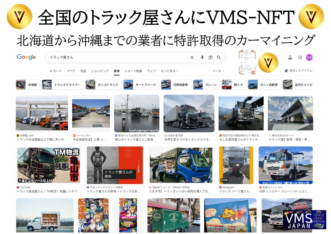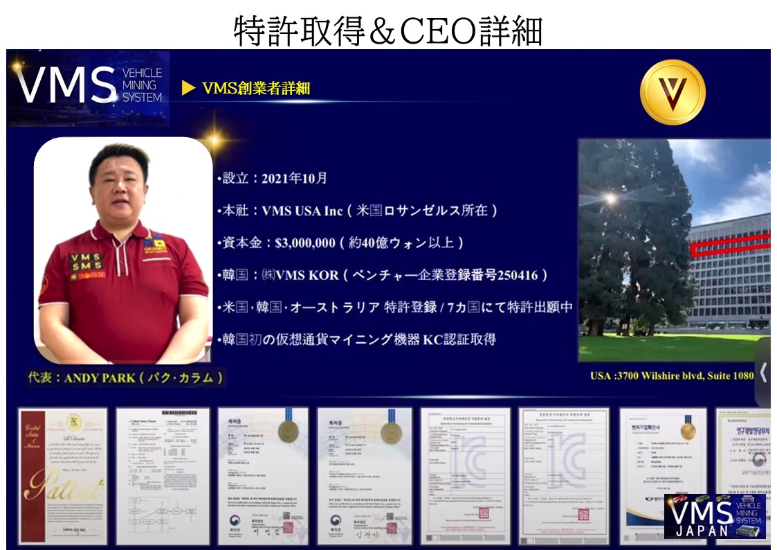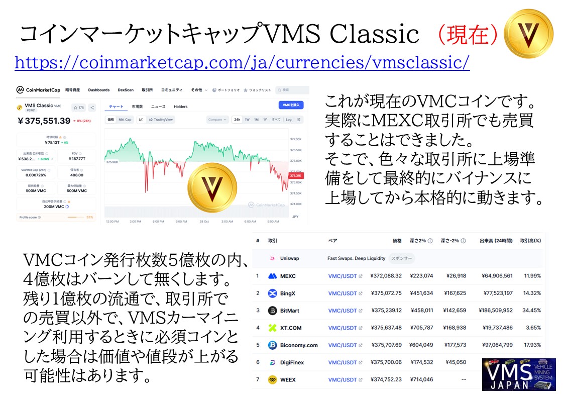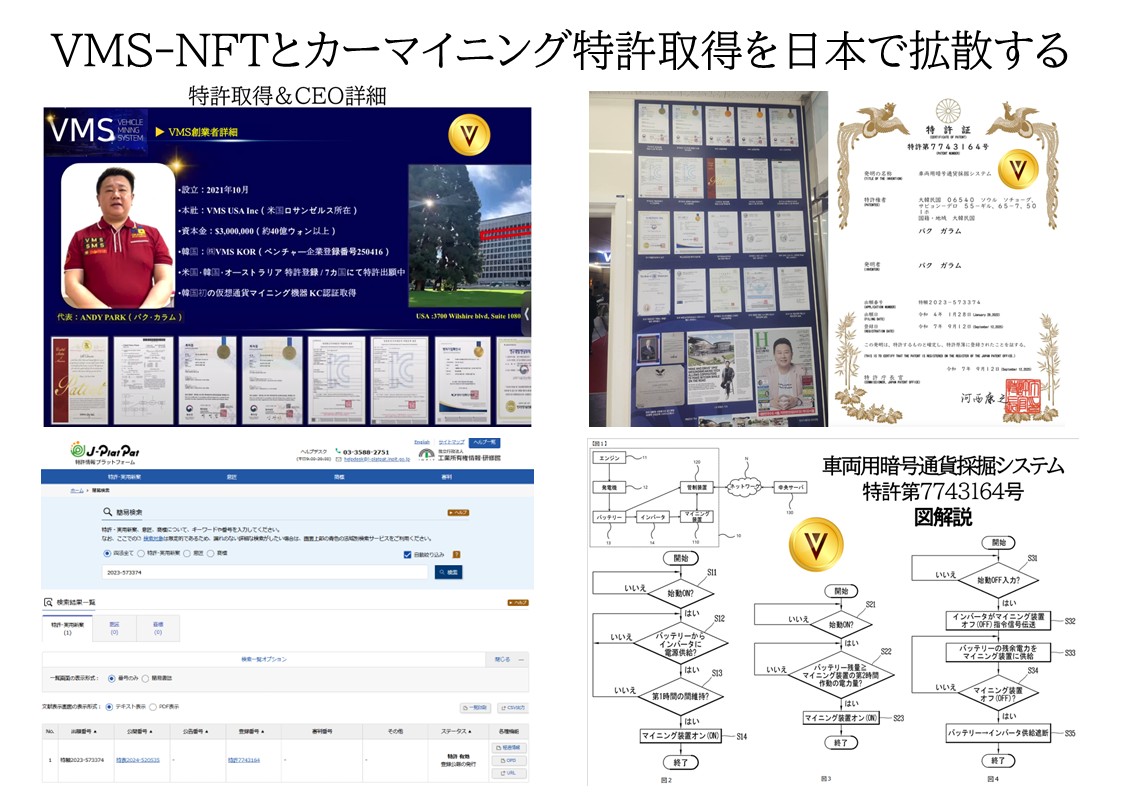 VMCコインの価値を上げ続ける カーマイニングとは? VMSJAPANカーマイニングイメージPV(1:11) 〜VMCコイン期間限定応援キャンペーン〜 取引所に上場している VMCコインをお得に貰っちゃおう♪ 今なら「無料エアードロップ」貰えます! 日本市場展開する前に海外で 盛り上がっているVMCコインの 軸となる特許取得内容をご確認ください 特許第 7743164 号 車両用暗号通貨採掘システム 発明者 パク ガラム 2023-573374 出願日2022年1月28日 登録日2025年9月12日 発行日2025年9月24日 特許情報プラットフォーム|J-PlatPat [JPP] https://www.j-platpat.inpit.go.jp/ 検索 2023-573374 【VMSのNFT応援企画】 今からVMSをNFTにして 流通していきます。 先行モニターとしてVMSの NFTモニター参加者には、 VMC1枚を 無料エアードロッププレゼントします!! VMSとは? VMCコインとは? こちらをご覧ください。 VMS-NFT応援団として参加する場合、 加盟登録代金として 1000ドルまたは 150,000円をお支払いください。 ※1000ドルまたは150,000円は、 VMS-NFT応援団加盟登録費としてお支払いすると 特典としてVMC1枚を 無料エアードロッププレゼントします!! ご理解できるかたのみご参加ください。 【VMS-NFT応援団として参加する】 無料エアードロップで貰った (VMCコイン売買条件)をお伝えします。 バイナンス取引所上場後に月間5%~10%だけ 利確(売却)するという条件になります。 または、VMS-NFTが完成した時に、 NFTとして利用可能です。 ステーキングするとメリットあります。 ※バイナンス取引所上場 2025年12月または2026年早期予定 専用アカウントを開設していただき、 そこにVMCを付与します。 1枚以上欲しい方は個別相談とします。 【VMCコインの発行元及び会社】 VMSコリア株式会社 本社見学動画(1:00) 2025年11月11日からマイニングカフェも オープンして後々VMCコインも使えるようになり、 120室のホテルも買収してマイニングホテルや、 キャンピングカーマイニングや、 色々なところでVMCコインが使えるようにします。 日本ではVMS-NFT流通でVMCも使えるようにします。 今のお得なエアードロップの時に、 ご参加いただけますと幸いです。 今回の企画は日本で事業展開するときに、 多くの方に1枚だけでもVMCを 持っていただき、共に長期的に、 事業とVMCの価値を上げていただき、 5億枚から4億枚無くした、 最終の1億枚になった時1枚の価値と価格で 幸せを感じていただきたいと思います。 1000ドルまたは、150,000円加盟金で、 2500ドル相当が60%OFFですね♪ VMC1枚を無料エアードロップで お得に参加して応援団としてご協力お願いします。 【VMS-NFT応援団として参加する】 VMS-NFT応援団に参加して 1VMCを特典で受け取る方はこちら 【VMS-NFT応援団として参加する】 VMSコリア株式会社と協力体制で、 【公式】VMSJAPANが独占募集いたします。 すでにオフィスがある方、 すでに営業部で販売環境がある方、 今から新規事業部を考えている方、 VMS事業またはVMS-NFTに興味がある方は 個別でご相談お願いします。 秘密保持契約を締結後に、内容をお伝えし、 業務委託契約で優遇した条件を提案いたします。 追伸 法人の方で利益を得ている場合、 節税や経費対策を考えている方にも メリットがあるお話しです。 他社の事例を参考にお伝えします。 【公式】VMSJAPAN LINE