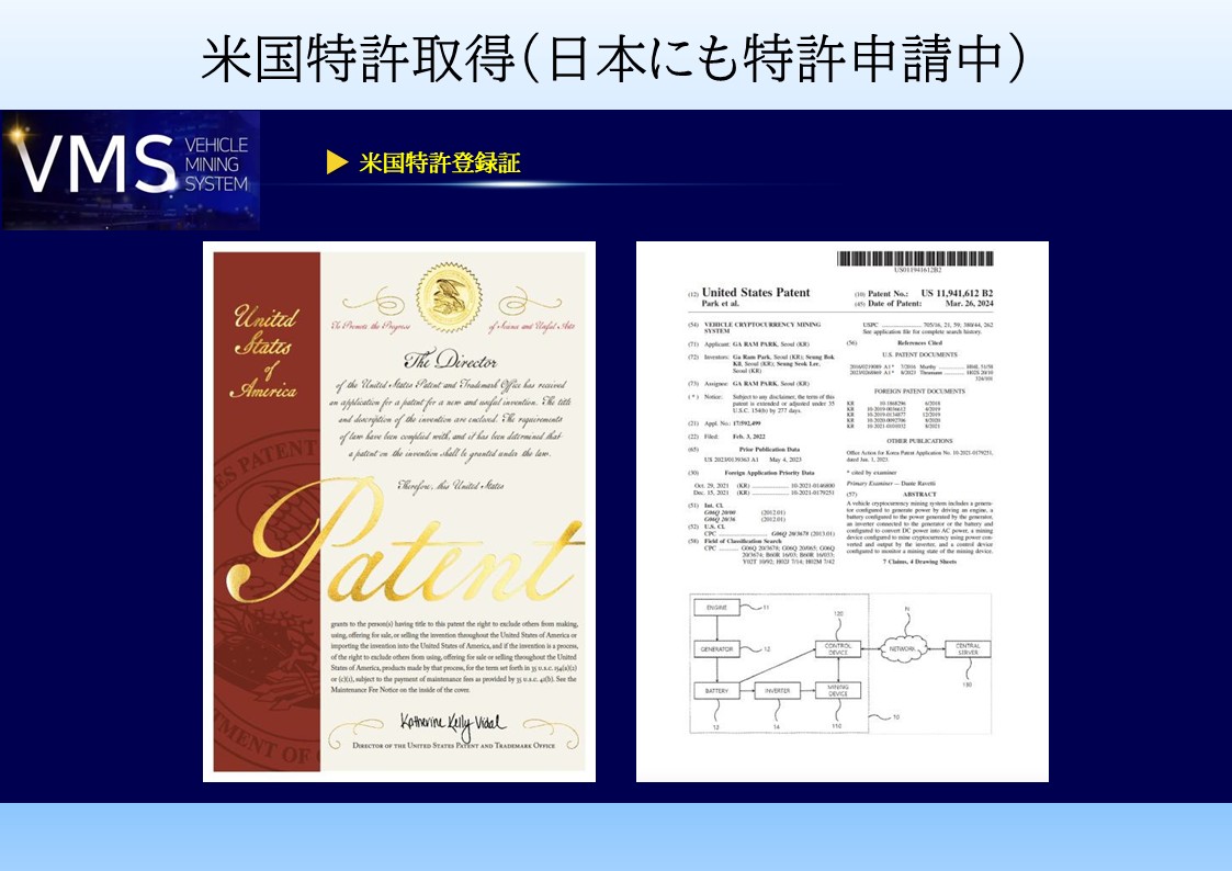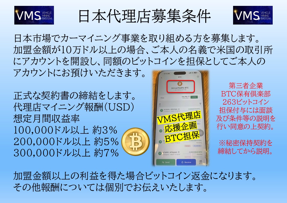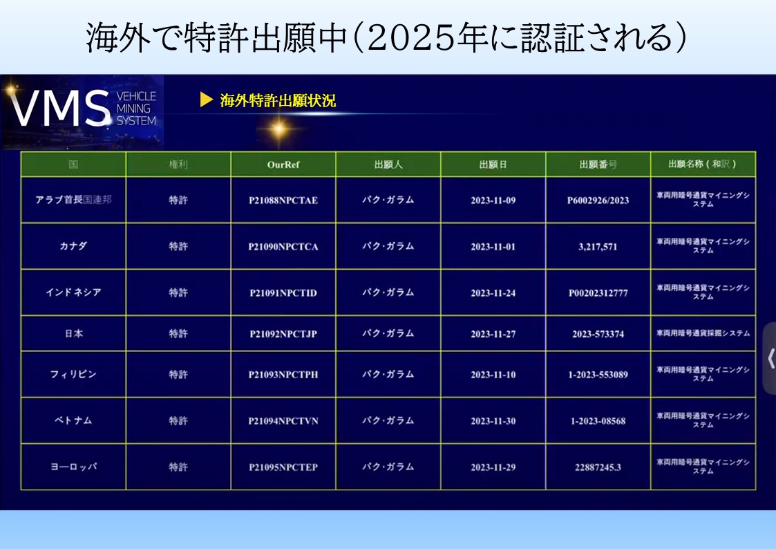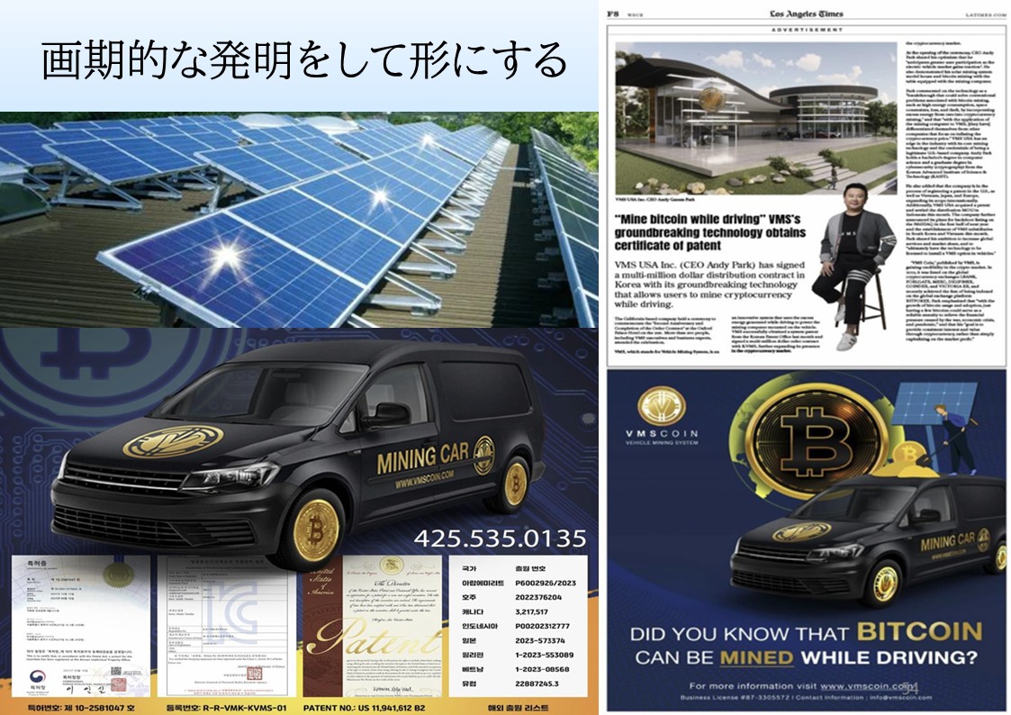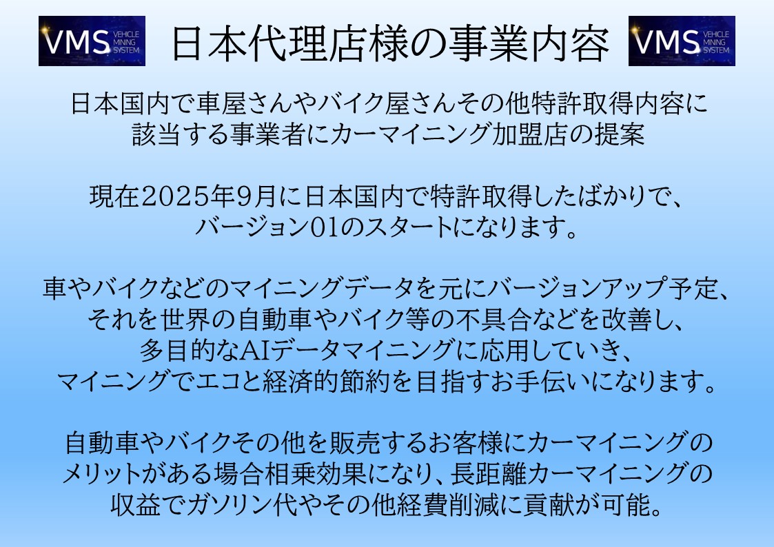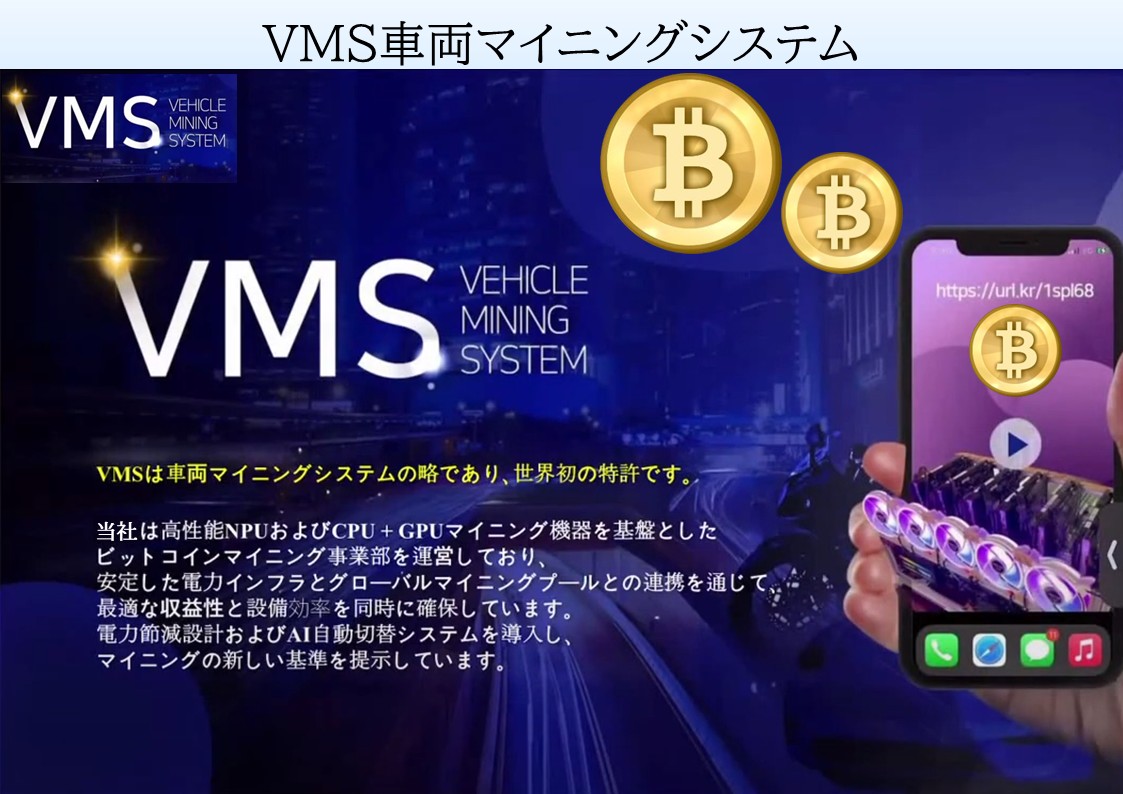 VMSJAPANカーマイニングイメージPV(1:11) 【日本特許取得済みVMS機械データ】 世界初の発明に驚きを隠せない!!(1:00) 〜日本特許取得キャンペーン〜 日本市場展開する前に特別モニター&アンケート 協力していただける方を募集します。 特許第 7743164 号 車両用暗号通貨採掘システム 発明者 パク ガラム 2023-573374 出願日2022年1月28日 登録日2025年9月12日 発行日2025年9月24日 特許情報プラットフォーム|J-PlatPat [JPP] https://www.j-platpat.inpit.go.jp/ 検索 2023-573374 【特別モニター&アンケート】 (ステップ1) PV動画(3分)を10本見ていただき、 映像と音源をチェックして 1位、2位、3位、良いと思った 順位をお伝えください。 (ステップ2) 特許サービス内容動画 (13分)2本見ていただき、 男性版または女性版、 良いと思った順位をお伝えください。 (ステップ3) 特許サービス内容資料 (50ページ)見ていただき、 感想をお伝えください。 (ステップ4) モニター代金として1000 ドルまたは 150,000円をお支払いください。 (ステップ5) 2025年10月31日金曜日23時59分まで お支払い完了した方は、 2026年1月15日から末までに 2000ドルまたは300,000円を モニター謝礼としてお支払いします。 2025年11月28日金曜日23時59分まで お支払い完了した方は、 2026年1月15日から末までに 1500ドルまたは225,000円を モニター謝礼としてお支払いします。 2026年1月お年玉還元に 合わせたキャンペーンになります。 基本おひとり様1口と なりますが代行購入可能。 モニターやアンケートは 本人がお願いします。 例、5口購入してまとめて支払い 5人が提出。 今回は1000口、1000人の モニター&アンケートとなります。 2026年からモニター&アンケートを 参考にして事業展開予定です。 (ステップ1) PV動画(3分)を10本見ていただき、 映像と音源をチェックして 1位、2位、3位、良いと思った 順位を紙に書いておきましょう。 所要時間約30分 【01】VMSカーマイニングセンター(3:00) 【02】VMSカーマイニングセンター(3:00) 【03】VMSカーマイニングセンター(3:00) 【04】VMSカーマイニングセンター(3:00) 【05】VMSカーマイニングセンター(3:00) 【06】VMSカーマイニングセンター(3:00) 【07】VMSカーマイニングセンター(3:00) 【08】VMSカーマイニングセンター(3:00) 【09】VMSカーマイニングセンター(3:00) 【10】VMSカーマイニングセンター(3:00) (ステップ2) 特許サービス内容動画(13分)2本見ていただき、 男性版または女性版、 良いと思った順位を紙に書いておきましょう。 所要時間約26分 【男性版】 VMSカーマイニング システムのご提案動画(12:53) 【女性版】 VMSカーマイニング システムのご提案動画(12:58) (ステップ3) 特許サービス内容資料 (50ページ)見ていただき、 感想をお伝えください。 (ステップ4) モニター代金として1000 ドルまたは 150,000円をお支払いください。 【特別モニター&アンケート協力者として参加する】 (ステップ5) 2025年10月31日金曜日23時59分まで お支払い完了した方は、 2026年1月15日から末までに 2000ドルまたは300,000円を モニター謝礼としてお支払いします。 2025年11月28日金曜日23時59分まで お支払い完了した方は、 2026年1月15日から末までに 1500ドルまたは225,000円を モニター謝礼としてお支払いします。 2026年1月お年玉還元に 合わせたキャンペーンになります。 基本おひとり様1口と なりますが代行購入可能。 モニターやアンケートは 本人がお願いします。 例、5口購入してまとめて支払い 5人が提出。 今回は1000口、1000人の モニター&アンケートとなります。 2026年からモニター&アンケートを 参考にして事業展開予定です。 【日本特許取得済みVMS取り扱い】 日本国内・海外でオフィス展開(1:00) すでにオフィスがある方、 すでに営業部で販売環境がある方、 今から新規事業部を考えている方、 VMS事業に興味がある方は 個別でご相談お願いします。 追伸 法人の方で利益を得ている場合、 節税や経費対策を考えている方にも メリットがあるお話しです。 他社の事例を参考にお伝えします。 【公式】VMSJAPAN LINE