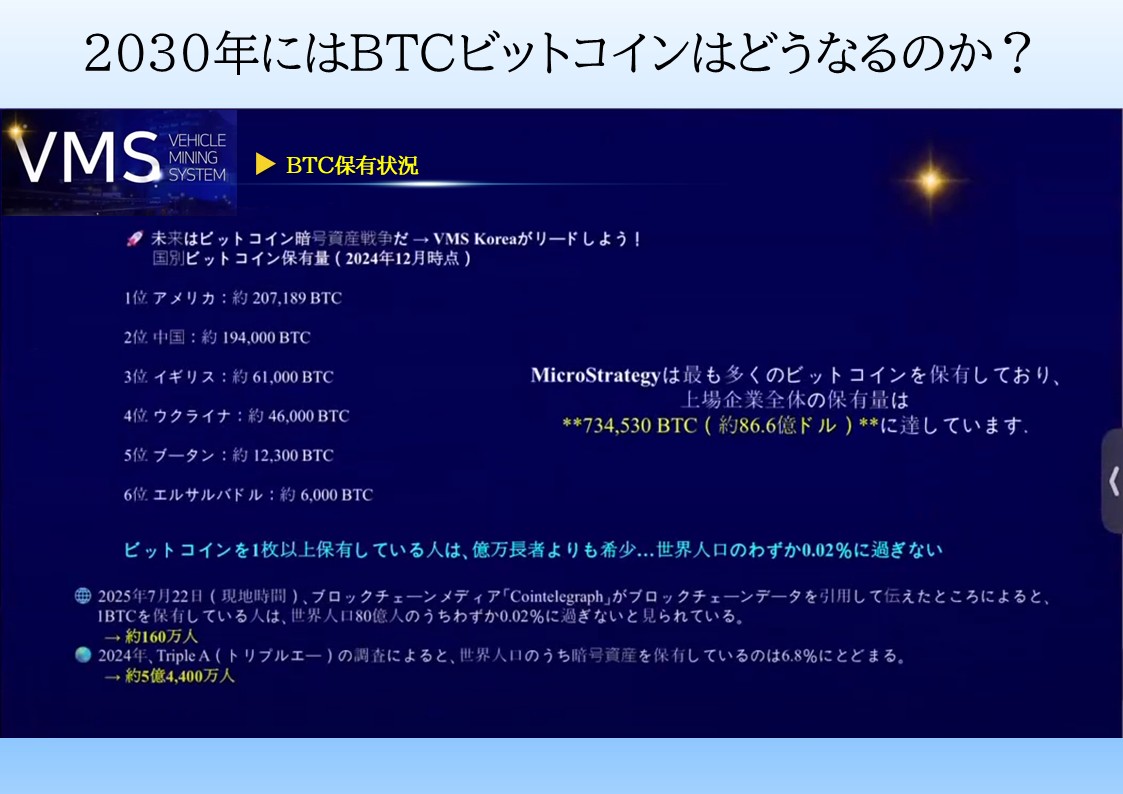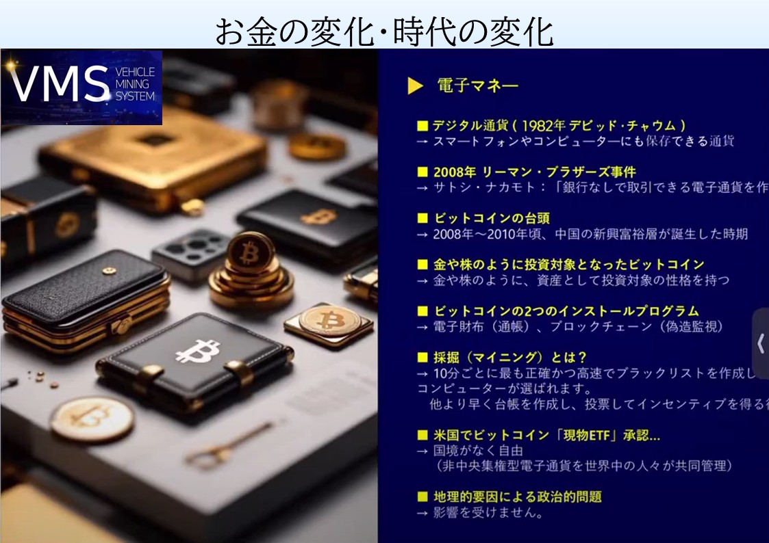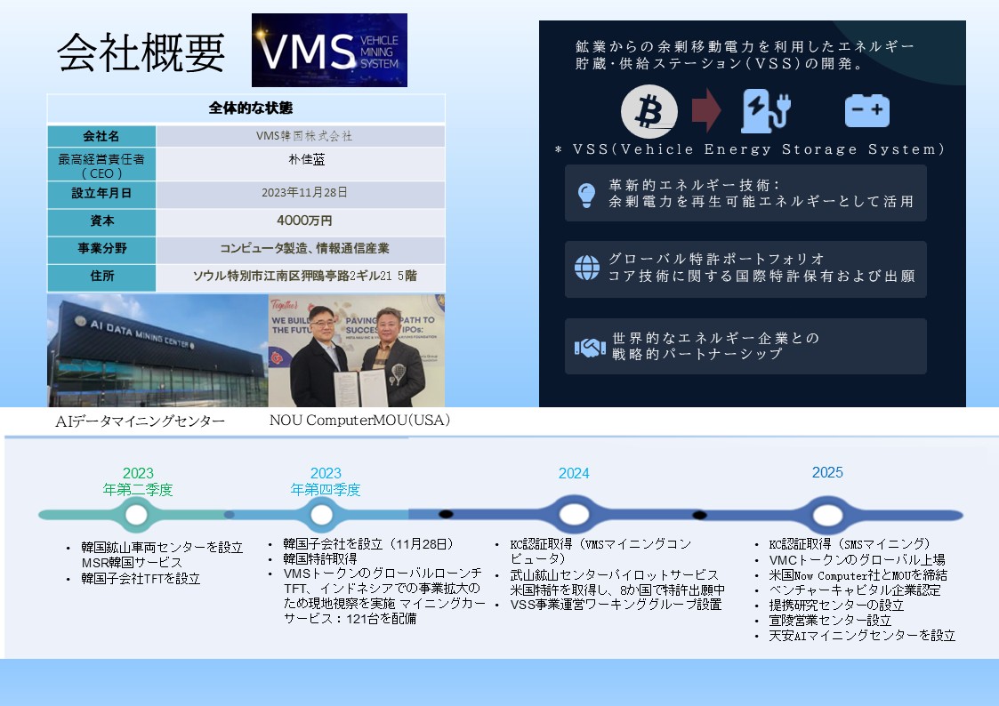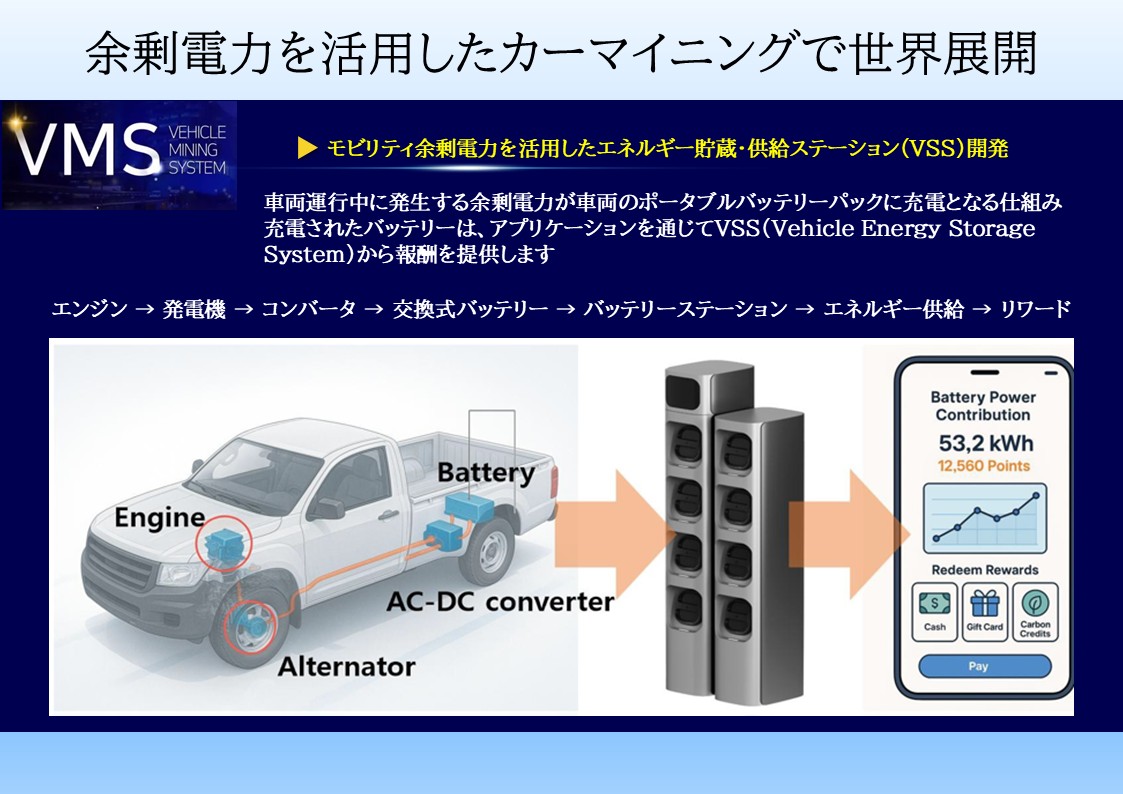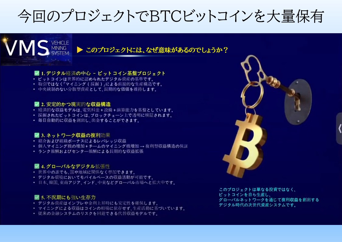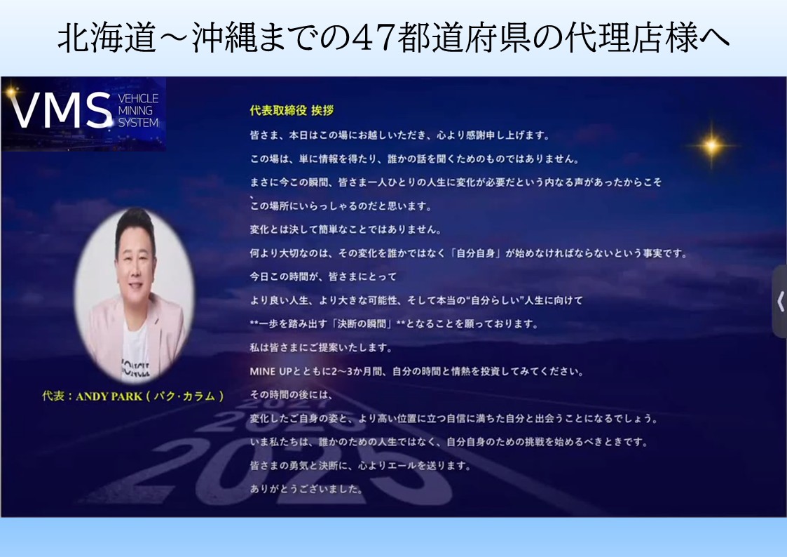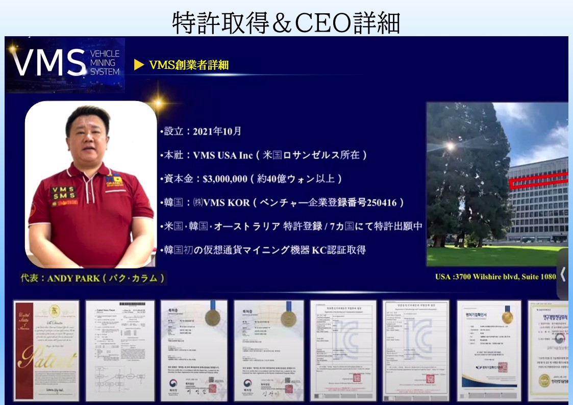 VMSJAPANカーマイニングイメージPV(1:11) 【日本特許取得済みVMS機械データ】 世界初の発明に驚きを隠せない!!(1:00) 〜日本特許取得キャンペーン〜 日本市場展開する前に特別モニター&アンケート 協力していただける方を募集します。 特許第 7743164 号 車両用暗号通貨採掘システム 発明者 パク ガラム 2023-573374 出願日2022年1月28日 登録日2025年9月12日 発行日2025年9月24日 特許情報プラットフォーム|J-PlatPat [JPP] https://www.j-platpat.inpit.go.jp/ 検索 2023-573374 【特別モニター&アンケート】 (ステップ1) PV動画(3分)を10本見ていただき、 映像と音源をチェックして 1位、2位、3位、良いと思った 順位をお伝えください。 (ステップ2) 特許サービス内容動画 (13分)2本見ていただき、 男性版または女性版、 良いと思った順位をお伝えください。 (ステップ3) 特許サービス内容資料 (50ページ)見ていただき、 感想をお伝えください。 (ステップ4) モニター代金として1000 ドルまたは 150,000円をお支払いください。 (ステップ5) 2025年10月31日金曜日23時59分まで お支払い完了した方は、 2026年1月15日から末までに 2000ドルまたは300,000円を モニター謝礼としてお支払いします。 2025年11月28日金曜日23時59分まで お支払い完了した方は、 2026年1月15日から末までに 1500ドルまたは225,000円を モニター謝礼としてお支払いします。 2026年1月お年玉還元に 合わせたキャンペーンになります。 基本おひとり様1口と なりますが代行購入可能。 モニターやアンケートは 本人がお願いします。 例、5口購入してまとめて支払い 5人が提出。 今回は1000口、1000人の モニター&アンケートとなります。 2026年からモニター&アンケートを 参考にして事業展開予定です。 (ステップ1) PV動画(3分)を10本見ていただき、 映像と音源をチェックして 1位、2位、3位、良いと思った 順位を紙に書いておきましょう。 所要時間約30分 【01】VMSカーマイニングセンター(3:00) 【02】VMSカーマイニングセンター(3:00) 【03】VMSカーマイニングセンター(3:00) 【04】VMSカーマイニングセンター(3:00) 【05】VMSカーマイニングセンター(3:00) 【06】VMSカーマイニングセンター(3:00) 【07】VMSカーマイニングセンター(3:00) 【08】VMSカーマイニングセンター(3:00) 【09】VMSカーマイニングセンター(3:00) 【10】VMSカーマイニングセンター(3:00) (ステップ2) 特許サービス内容動画(13分)2本見ていただき、 男性版または女性版、 良いと思った順位を紙に書いておきましょう。 所要時間約26分 【男性版】 VMSカーマイニング システムのご提案動画(12:53) 【女性版】 VMSカーマイニング システムのご提案動画(12:58) (ステップ3) 特許サービス内容資料 (50ページ)見ていただき、 感想をお伝えください。 (ステップ4) モニター代金として1000 ドルまたは 150,000円をお支払いください。 【特別モニター&アンケート協力者として参加する】 (ステップ5) 2025年10月31日金曜日23時59分まで お支払い完了した方は、 2026年1月15日から末までに 2000ドルまたは300,000円を モニター謝礼としてお支払いします。 2025年11月28日金曜日23時59分まで お支払い完了した方は、 2026年1月15日から末までに 1500ドルまたは225,000円を モニター謝礼としてお支払いします。 2026年1月お年玉還元に 合わせたキャンペーンになります。 基本おひとり様1口と なりますが代行購入可能。 モニターやアンケートは 本人がお願いします。 例、5口購入してまとめて支払い 5人が提出。 今回は1000口、1000人の モニター&アンケートとなります。 2026年からモニター&アンケートを 参考にして事業展開予定です。 【日本特許取得済みVMS取り扱い】 日本国内・海外でオフィス展開(1:00) すでにオフィスがある方、 すでに営業部で販売環境がある方、 今から新規事業部を考えている方、 VMS事業に興味がある方は 個別でご相談お願いします。 追伸 法人の方で利益を得ている場合、 節税や経費対策を考えている方にも メリットがあるお話しです。 他社の事例を参考にお伝えします。 【公式】VMSJAPAN LINE